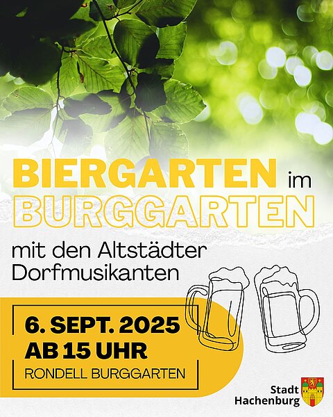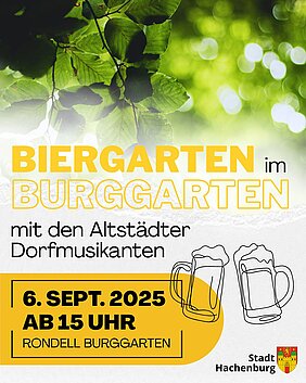 Am 6. September 2025 ab 15 Uhr lädt die Stadt Hachenburg gemeinsam mit den Altstädter Dorfmusikanten herzlich zum gemütlichen Biergarten im Burggarten ein. Von 15 – 18 Uhr sorgen die Altstädter Dorfmusikanten für beste musikalische Unterhaltung. Veranstaltungsort ist das Rondell am Ende des Burggartens, zwischen dem Landschaftsmuseum und dem großen Spielplatz. Wir freuen uns auf Euer Kommen!