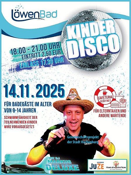 Das Familienzentrum Hachenburg sowie das Jugendzentrum Hachenburg laden am 14.11.2025 zur Kinderdisco ins Löwenbad Hachenburg ein.