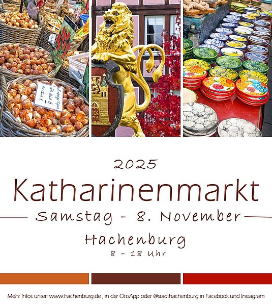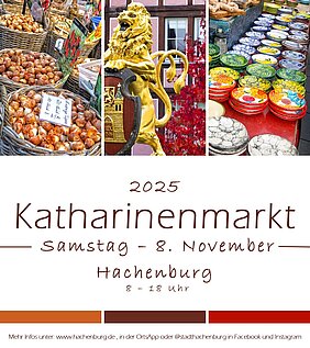 Mit einer über 500 jährigen Tradition ist der Hachenburger Katharinenmarkt auch weit über die Grenzen der Löwenstadt bekannt. Jährlich finden sich tausende Besucherinnen und Besucher in der historischen Innenstadt ein, um bei einem ausgiebigen Marktbummel die über 300 Marktstände auf dem größten eintägigen Markt in Rheinland-Pfalz begutachten zu können. Ob wärmende Socken aus kuscheliger Schafswolle für den kalten Westerwälder Winter, Körbe prall gefüllt mit Obst, Blumen oder Wurst, würzige Kräuterbonbons oder kreative Geschenkideen: Beim Katharinenmarkt bleiben keine Wünsche offen. Neben den Verkaufsständen gibt es selbstverständlich genügend Verköstigungsstände, die die Besucher mit Köstlichkeiten wie Glühwein, Bratwurst, Waffeln, Reibekuchen, Champignons und vielem mehr versorgen. Die einzigartige Atmosphäre und die Aussicht, viele Freunde zu treffen, machen den Katharinenmarkt zu einem erfreulichen Pflichttermin an sonst so trüben Novembertagen, stets am ersten Samstag im November.