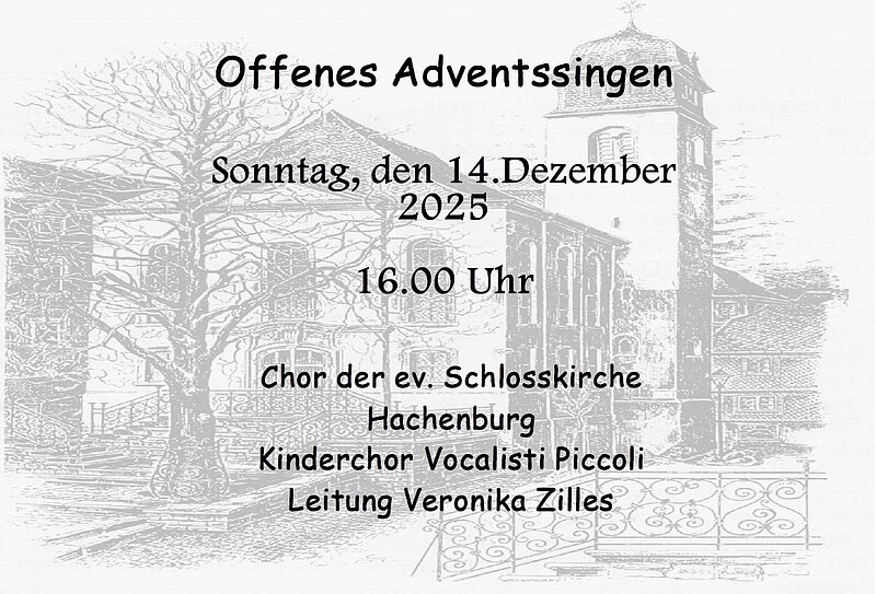 Der Schlosskirchenchor Hachenburg, seit vielen Jahren verbunden mit Traditionen und seit 1996 von Veronika Zilles geleitet, hält das Besinnen lebendig. Auch in diesem Jahr laden wir am dritten Adventssonntag herzlich zum Offenen Adventssingen in der Schlosskirche Hachenburg ein. Eine besinnliche Stunde mitten im bunten Treiben des Weihnachtsmarktes – eine kleine Oase der Ruhe und des Nachdenkens, die den Chor und seine Zuhörer auf das bevorstehende Fest einstimmt.