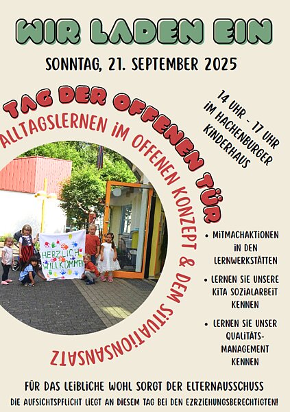 Das Hachenburger Kinderhaus lädt herzlich zum Tag der offenen Tür am Sonntag, 21. September 2025, von 14 bis 17 Uhr ein. Besucherinnen und Besucher können die Einrichtung, die Lernwerkstätten sowie das pädagogische Konzept kennenlernen. Für das leibliche Wohl sorgt der Elternausschuss.