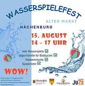Die Idee zum Fest kam ursprünglich von den Kinderstadtdirektorinnen und -direktoren und weil es so gut angekommen ist, wird es in diesem Jahr einfach fortgesetzt – in diesem Jahr in Kooperation mit dem Juze Hachenburg. Auch diesmal dreht sich jede einzelne Station rund ums Thema Wasser: Ob Fische angeln, Dosen mit Wasserpistolen treffen, durch die Bobbycar-Waschstraße sausen oder Wasser spielerisch am Spielemobil des Juze entdecken, für jede und jeden ist etwas dabei.
