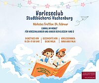 Am 24. Februar findet zwischen 16.30 und 17.00 Uhr das nächste Treffen aller Leseclub-Kinder in der Stadtbücherei Hachenburg statt. Auch neue Zuhörerinnen und Zuhörer im Alter ab 5 Jahren sind herzlich willkommen.