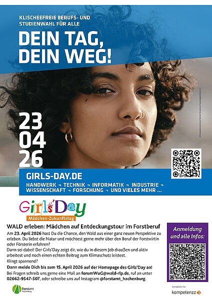 Am Girls'Day, den 23.04.26, öffnet das Forstamt seine Türen für Mädchen und junge Frauen, die einen spannenden Blick hinter die Kulissen werfen möchten. Die Teilnehmenden lernen verschiedene Berufe im Forst kennen - von der Arbeit unserer Försterinnen über die der Forstwirtinnen im Wald bis hin zu Aufgaben in Planung, Naturschutz und Holzmanagement. Der Girls'Day 2026 bietet eine einmalige Gelegenheit, die spannenden Möglichkeiten in der Forstwirtschaft kennenzulernen und sich für die Zukunft unserer Wälder einzusetzen.